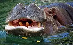 Зубов у гиппопотама 36 — в каждой челюсти 2 клыка, 4 резца, 6 предкоренных и 6 коренных зубов[8]. Верхний слой эмали зубов жёлтого цвета, он обладает исключительной твёрдостью и прочностью. Клыки и резцы у бегемота исключительно велики; они никогда не используются для срывания растительности или её пережёвывания — первые используются в основном как оружие, а резцы — как оружие, а также для рытья, особенно при поедании солёной почвы на солонцах[8].