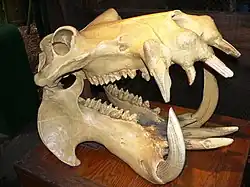 Особенного развития достигают клыки нижней челюсти, острота которых постоянно поддерживается благодаря самозатачиванию при трении о клыки верхней челюсти[9]. По форме они серповидные; остриё их направлено вверх, а при большой длине всё сильнее загибается назад. Клыки самцов гораздо длиннее, чем у самок. Они не имеют корней и растут всю жизнь, достигая иногда массы около 3 кг каждый; крупнейший из нормально развитых бегемотовых клыков, хранящийся в Бельгии, имеет длину 64,5 см[6]. Форма нижних клыков характеризуется наличием хорошо заметной продольной канавки, которая отсутствует на клыках верхней челюсти[11].