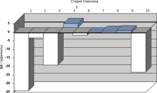 Поэтому при нормальных условиях, а также клеточных условиях (отличных от нормальных) гликолиз является в значительной мере необратимым процессом благодаря значительному уменьшению свободной энергии системы[7].