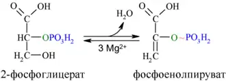 Механизм реакции, катализируемой енолазой, включает стабилизацию промежуточного продукта ионами Mg2+. В ходе этой реакции соединение с относительно низким потенциалом для транспорта фосфата (ΔG′о при гликолизе 2-фосфоглицерата составляет −17,6 кДж/моль) в соединение с высоким потенциалом для транспорта фосфата (ΔG′о при гликолизе ФЕП составляет −61,9 кДж/моль)[18].