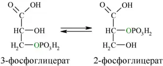 Фермент фосфоглицератмутаза катализирует обратимый перенос фосфорильной группы с С3 на С2 глицерата, приводящий к образованию 2-фосфоглицериновой кислоты. Для этой реакции необходим Mg2+[16]: