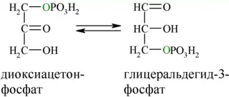 Лишь один из двух продуктов альдолазной реакции — глицеральдегид-3-фосфат — может участвовать в дальнейших превращениях гликолиза. Другой продукт — дигидроксиацетонфосфат — быстро и обратимо переводится в глицеральдегид-3-фосфат ферментом триозофосфатизомеразой[12]: