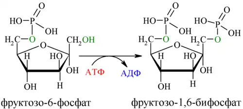 В третьей реакции гликолиза, протекающей с затратой АТФ, фермент фосфофруктокиназа-1 катализирует перенос фосфорильной группы от АТФ на фруктозо-6-фосфат с образованием фруктозо-1,6-бисфосфата[8]: