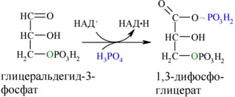 В первой реакции второго этапа гликолиза молекула глицеральдегид-3-фосфата окисляется и фосфорилируется в 1,3-бисфосфоглицерат, эта реакция катализируется глицеральдегид-3-фосфатдегидрогеназой[13]: