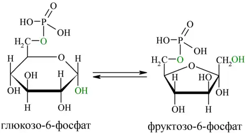 Фермент фосфогексозоизомераза, или фосфоглюкозоизомераза катализирует обратимую изомеризацию глюкозо-6-фосфата (альдозы) во фруктозо-6-фосфат (кетозу)[8]: