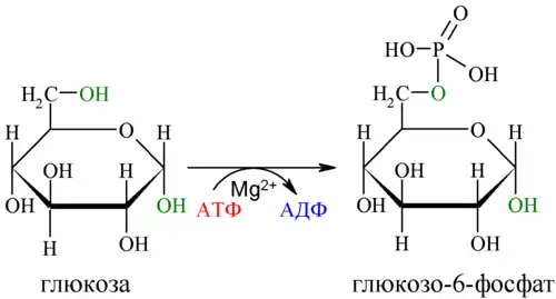 Эта реакция катализируется ферментом гексокиназой (в клеточных условиях гексокиназа неспособна осуществлять обратную реакцию). Он относится к группе киназ — ферментов, катализирующих перенос терминальной фосфорильной группы с АТФ на акцептор — нуклеофил. В случае гексокиназы акцептором является гексоза, как правило, D-глюкоза, хотя в некоторых тканях гексокиназа также может катализировать фосфорилирование и других распространённых гексоз, например, D-фруктозы и D-маннозы[8] (подробнее см. ниже).
