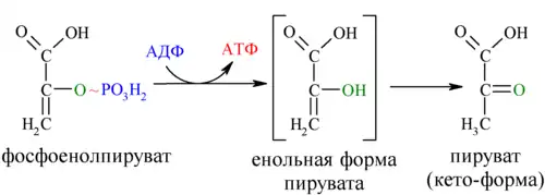 Таким образом, эта реакция представляет собой субстратное фосфорилирование. Её продукт — пируват — вначале образуется в енольной форме, которая затем быстро таутомеризуется в кето-форму, которая преобладает при pH = 7 (то есть в клеточных условиях)[18].