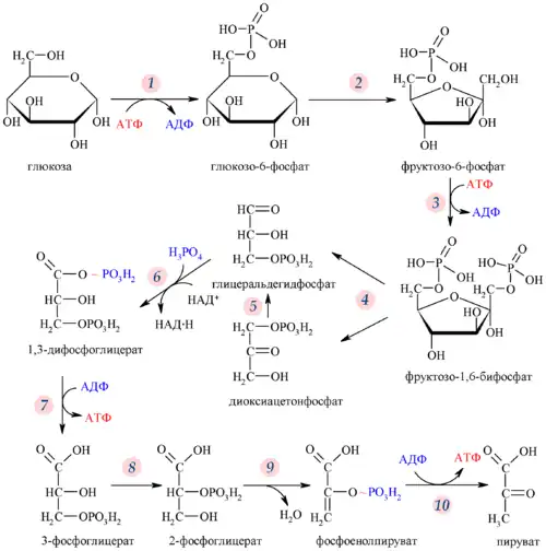 - фосфорилирование АДФ до АТФ, осуществляемое при отрыве фосфата от соединений с высоким потенциалом переноса фосфата, образующихся при гликолизе (таким образом, АТФ при гликолизе образуется за счёт субстратного фосфорилирования, в отличие от окислительного фосфорилирования дыхательной цепи, где АТФ образуется за счёт переноса электронов и протонов по цепи переносчиков[6]);