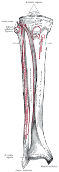 В составе голени различают переднюю и заднюю области, граница между которыми снаружи проходит от заднего края головки малоберцовой кости к заднему краю наружной лодыжки, а внутри — по внутреннему краю большеберцовой кости.