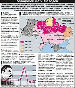Голодомо́р[1] (укр. Голодомор) — массовый голод в 1932—1933 годах в Украинской ССР в существовавших на тот период границах[2][3], вызванный, в том числе, политикой советского руководства, и повлёкший многомиллионные человеческие жертвы[4]. В 31 стране признан актом геноцида. По мнению множества историков, за голод непосредственно ответственны Иосиф Сталин и правительство СССР. Среди историков фигурируют разные мнения на тему того, в какой степени к голоду привели непосредственно действия правительства СССР, и в какой степени правительство СССР и лично Сталин сознательно проводили действия, приведшие к голоду, хотя и сходятся, что сталинская политика коллективизации была одной из важнейших причин.