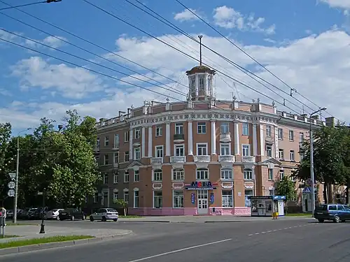 Башня со шпилем, увенчанным звездой в лавровом венке. Памятник архитектуры. 1954 год постройки. Улица Советская, 41