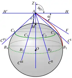 Горизо́нт (др.-греч. ὁρίζων — буквально: ограничивающий), уст. закро́й как собственно черта и о́видь как очерченная область[1] — условная черта, ограничивающая поле зрения наблюдателя на поверхности шаровидного небесного тела (изначально Земли); из-за естественной кривизны этой поверхности (в отсутствие иных неровностей рельефа) выглядит для наблюдателя как ровный край обозреваемого им кругового участка поверхности; согласно определению в словаре В.Даля, горизонт есть «черта, отделяющая видимую нами часть неба и земли от невидимой»[1]. По другому определению в понятие входит не только «граница неба с земной или водной поверхностью»[2], но и видимая часть этой поверхности[3] — ср. уст. кругозо́р, озо́р, а также о́видь как всё пространство, окидываемое взглядом до этой границы[4]. Различают горизонт видимый и горизонт истинный. Угол между плоскостью истинного горизонта и направлением на видимый горизонт называют наклонением горизонта (синонимы: понижение горизонта, депрессия горизонта)[5]. На иллюстрации: точка A — точка наблюдения; Н’Н — плоскость истинного горизонта; отрезок AC1 — геометрическая (теоретическая) дальность видимого горизонта; дуга AB1 — географическая дальность видимого горизонта; угол α — наклонение горизонта; B1B2B3B4 — линия видимого горизонта.