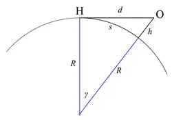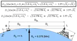 - Здесь d — геометрическая дальность видимого горизонта, R — радиус Земли, h — высота точки наблюдения относительно поверхности Земли[9].