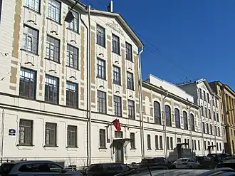 В здании было 20 классов для 1000 учеников обоих полов. Классы расположены на 2-4 этажах, в лицевом корпусе они выходят на юг. Актовый зал освещён как с улицы, так и со двора, к нему примыкала церковь. На первом этаже были раздевалки, кабинет врача, столовая, читальный зал, квартиры заведующих и комнаты слуг. Во дворе была игровая площадка[6] (на месте которой в 2024 году было запланировано сделать новую пристройку[8]).