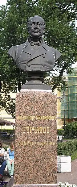 • 16 октября 1998 года в соответствии с распоряжением губернатора Санкт-Петербурга к двухсотлетнему юбилею со дня рождения дипломата в Александровском саду (Санкт-Петербург) на пространстве у фонтана был открыт бюст А. М. Горчакова. За основу скульпторами был взят небольшой бюст канцлера, выполненный в 1870 году скульптором К. К. Годебским[15]. Высота бюста 1,2 м, постамента — 1,85 м. Авторы памятника: скульпторы К. К. Годебский (1835—1909), Ф. С. Чаркин (1937), Б. А. Петров (1948); Архитектор С. Л. Михайлов (1929); Художник-дизайнер: Соколов, Николай Николаевич (1957). Материал памятника: Бюст — бронза, отливка произведена на заводе «Монументскульптура»; Постамент и основание — розовый гранит, доставлен из месторождения «Кашина Гора» (Карелия). Надписи на памятнике: на постаменте: