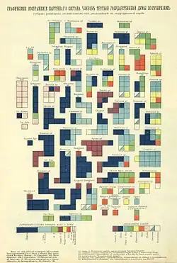 • по партийной принадлежности: 225 депутатов от правых и октябристов, 52 кадета, 26 депутатов от национальных меньшинств, 14 трудовиков, 14 социал-демократов. Партия октябристов была одной из ведущих. Часть депутатов октябристов объединилась с умеренными правыми, образовав ведущую новую группировку в Думе — Партию русских националистов, которую возглавил Пётр Балашов[2]. Эта группировка стала «законодательным центром» Третьей Думы.