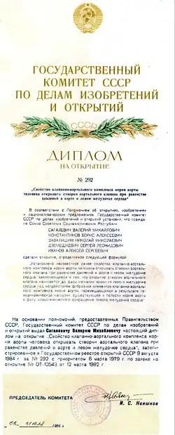 - Свойство клапанно-аортального комплекса корня аорты человека открывать створки аортального клапана при равенстве давлений в аорте и левом желудочке сердца. В. М. Сагалевич, Б. А. Константинов, Н. Н. Завалишин, С. Л. Дземешкевич, А. С. Иванов. № 292 с приоритетом от 6 марта 1979 г.