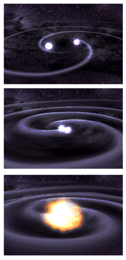 Двойные системы из массивных объектов, вращающихся друг вокруг друга — важный источник излучения для гравитационно-волновой астрономии. Во время вращения система излучает гравитационные волны, которые уменьшают тензор напряжений энергии-импульса, вызывая уменьшение радиуса орбиты[1][2]. Здесь показана двойная система белых карликов, важный источник для космических детекторов, таких как eLISA. Слияние белых карликов может породить сверхновую, изображенной взрывом на третьем рисунке. |
