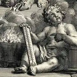 Ангел, держащий термометр со старой шкалой Цельсия. Фрагмент фронтисписа книги К. Линнея Hortus Cliffortianus, 1738