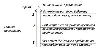 - Если в придаточном предложении при согласовании времён есть ряд последовательных действий, относящихся к прошлому, то первое из этих действий становится в Past perfect, а остальные могут стоять в Past simple. Если появляется действие, которое нарушает последовательность, то оно ставится в Past perfect. Например: Он сказал, что его сестра пришла домой, сняла пальто, помыла руки, открыла холодильник, а брат уже съел её мороженое. He said his sister had come[5] home, took off her coat, washed her hands, opened the refrigerator, and her brother had already eaten[5] her ice cream.