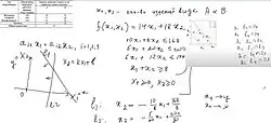 Если многоугольник решений ограничен (см. рисунок), то прямая дважды становится опорной по отношению к многоугольнику решений (в точках и ), причём минимальное значение принимает в точке . Координаты точки находим, решая систему уравнений прямых и .