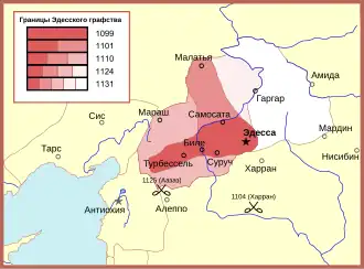 В 1116 — 1117 годах за счет захвата владений армянских князей территория графства значительно увеличивается. У Васила Тга был отнят Рабан, Кесун, Ромкла, Бехесни и возможно Хисн Мансур. Из Пира был изгнан князь Абелгариб Пахлавуни, владения которого были аннексированы. Изгнанию подвергся и некогда сподвижник и проводник крестоносцев в Малой Азии, князь Гуриса Баграт Камсаракан[6]