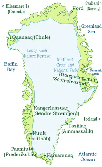 - ↑ Facts about Greenland - Naalakkersuisut (англ.). naalakkersuisut.gl — The Government of Greenland, official site. Дата обращения: 23 июня 2021. Архивировано 24 июня 2021 года.