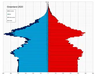 Население Гренландии по данным на 2019 год составляло 55 992 человека[1], что даёт плотность населения всего архипелага в 0,027 чел./км². Основные народы на территории Гренландии — это гренландские эскимосы (на местном языке — калааллиты), составляющие около 90 % всего населения; остальные 10 % — в основном датчане и другие европейцы.