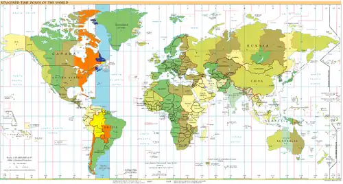 оранжевым — зона UTC-4 летом (апрель-октябрь) в Северном полушарии (зимой (ноябрь-март) — UTC-5) и зона UTC-4 зимой (апрель-октябрь) в Южном полушарии (летом (ноябрь-март) — UTC-3)