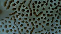 • Перегородки между соседними клетками гифы (септы) имеют поры, через которые может перетекать протопласт; ядра перемещаются между клетками в обход септы при помощи специальных механизмов. Кроме высших грибов, пористые септы встречаются у красных водорослей (Florideophyceae).