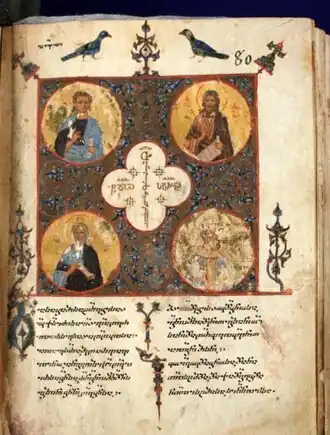 Древнейшая из грузинских азбук, обнаруженная в Верхней Сванетии на западной стене Ацской церкви Архангелов, содержит 37 букв и датируется XI веком. Самыми древними грузинскими надписями являются две из четырёх надписей, обнаруженных при раскопках древнегрузинского монастыря в Бир-эль-Кутте в 2 км от Вифлеема, в Палестине, и датируемых 429—444 гг., хотя не все учёные согласны со столь ранней датировкой. Надпись Болнисского Сиона является второй по древности (493—494 гг.)[53]. Сохранились около 10[54]—12 тыс.[55] средневековых грузинских рукописей.