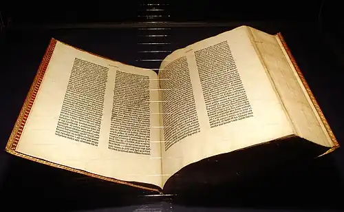 Его главная работа, Библия Гутенберга (также известная как Библия из 42 строк), была первой печатной версией Библии и получила признание за её высокое эстетическое и техническое качество.