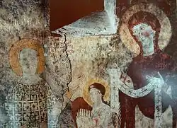 Восточный фасад церкви украшает аркатура из трёх декоративных арок. Самая широкая и высокая арка находится посередине, она содержит узкий оконный проём с завершением в виде декоративной пилястры. Выше окна находятся барельефы ктиторов, область ниже окна покрыта надписями. Две треугольные ниши по обеим сторонам срединной арки обозначают алтарь. Полукруглые бровки ниш покрыты орнаментом[26].