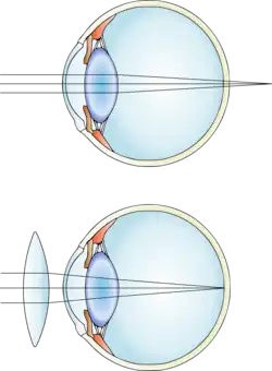 Дальнозоркость может быть исправлена при помощи как очков, так и контактных линз, чтобы изменить направление лучей света в глазу. Больные зачастую вынуждены носить очки или контактные линзы всё время или только для близи (читая, работая на компьютере или выполняя другую близкую работу).