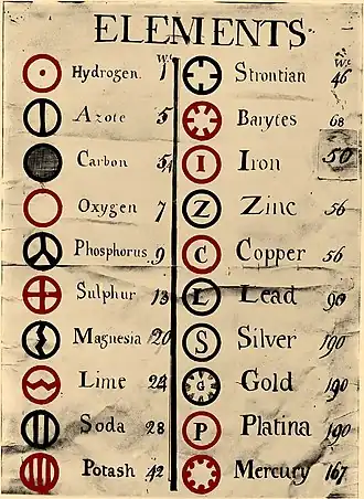 Для визуализации своей теории Дальтон использовал собственную систему символов, также представленную в «Новом курсе химической философии». Продолжая исследования, Дальтон через некоторое время опубликовал таблицу относительных атомных весов шести элементов — водорода, кислорода, азота, углерода, серы, фосфора, приняв массу водорода равной 1. Заметим, что Дальтон не дал описания способа, которым он определил относительные веса, но в его записях от 6 сентября 1803 года[15] мы находим таблицу расчета этих параметров на основе данных различных химиков по анализу воды, аммиака, диоксида углерода и других веществ.