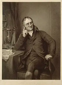 Джон Да́льто́н[4] (Долтон)[5] (англ. John Dalton; 6 сентября 1766 — 27 июля 1844) — английский физик и химик, метеоролог, естествоиспытатель и создатель химического атомизма. В 1794 году впервые провёл исследования и описал дефект зрения, которым страдал сам, — цветовую слепоту, позже названную в его честь дальтонизмом; открыл закон парциальных давлений (закон Дальтона) (1801), закон равномерного расширения газов при нагревании (1802), закон растворимости газов в жидкостях (закон Генри — Дальтона). Установил закон кратных отношений (1803), обнаружил явление полимеризации на примере этилена и бутилена, ввёл понятие «атомный вес», первым рассчитал атомные веса (массы) ряда элементов и составил первую таблицу их относительных атомных масс, заложив тем самым количественные основы для древней атомной теории строения вещества.
