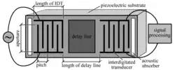 Датчик на ПАВ состоит из пьезоэлектрической подложки, встречно-штыревого преобразователя (ВШП) по одну сторону от поверхности соприкасающейся с исследуемым материалом и второго ВШП на другой стороне подложки. Пространство между ВШП, по которой поверхностная акустическая волна будет распространяться называется линией задержки, поскольку сигнал, который представляет собой механическую волну в этой области, движется гораздо медленнее, чем его электромагнитная часть, тем самым вызывая заметные задержки.