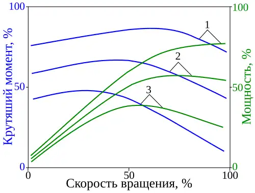 Скоростные характеристики ДВС с количественным регулированием: 1- внешняя, 2 и 3 — частичные при различных положениях дроссельной заслонки. При количественном регулировании максимум крутящего момента при снижении мощности смещается в область низких оборотов.