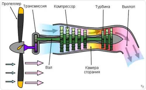 Турбовинтовой авиационный двигатель включает в себя винтовой движитель (пропеллер), редуктор и собственного газотурбинный двигатель внутреннего сгорания