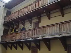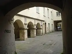 В фасаде восточного корпуса, выходящего в северный двор, имеется аркада четырёх сегментных арок. Вдоль второго этажа одного из фасадов южного двора идёт характерная для дворов Старого города деревянная галерея. Дворы соединяются арочным проездом