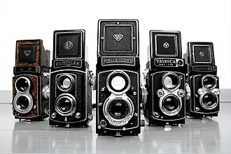 Самым известным брендом двухобъективных зеркальных камер считается Rolleiflex, разработанный в 1928 году и ставший образцом для подражания большинства производителей фототехники. Фотоаппараты подобной конструкции оставались популярны до начала 1960-х, когда были вытеснены с рынка усовершенствованными однообъективными фотоаппаратами[10][11]. Усовершенствования коснулись использования зеркала постоянного визирования, не требующего взвода затвора для опускания, и механизмов прыгающей диафрагмы, устраняющей затемнение видоискателя при диафрагмировании. В отличие от двухобъективных, однообъективные зеркальные фотоаппараты избавлены от параллакса, позволяют наглядно оценить глубину резко изображаемого пространства, боке, а также эффекты от применения различных светофильтров и насадок[12]. Кроме того, использование сменной оптики ничем не ограничено. В целом, двухобъективная система значительно уступает в функциональности и гибкости однообъективной, пригодной для любых общефотографических и прикладных задач. По этой причине выпуск двухобъективных фотоаппаратов был постепенно прекращён. К моменту появления цифровой фотографии двухобъективная схема считалась устаревшей и в цифровых фотоаппаратах не использовалась. Единственное исключение составляет двухмегапиксельный Rolleiflex MiniDigi, выпущенный в 2004 году для любителей аппаратуры ретростиля[13].