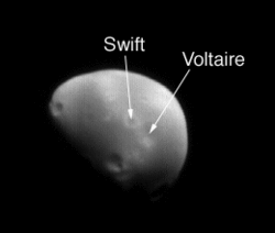 На Деймосе только две детали рельефа, которые имеют собственные имена. Это кратеры Свифт (диаметром 1000 метров) и Вольтер (диаметром 1900 метров), названные в честь двух писателей, которые предсказали существование у Марса двух спутников ещё до их открытия.