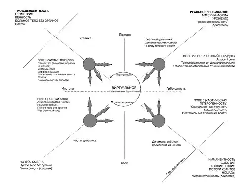Актуальное, виртуальное, интенсивность — три независимых онтологических измерения[4]. Актуальное — это настоящее, положение вещей, данное в опыте; виртуальное есть всё, что не является актуальным, чистое прошлое, которое никогда не было настоящим [277]. Виртуальное полностью участвует в генезисе и эволюции актуальных вещей; его нельзя смешивать с возможным и нужно рассматривать в терминах ясности и неясности[278]. Виртуальное есть достаточное основание для актуального и поэтому неразрывно с ним связано: любой объект содержит и виртуальное, и актуальное[279]. К. Боундас отмечает, что схема отношений здесь не двойная, а тройная: виртуальное-актуальное-виртуальное[280]. Виртуальное содержит «множественности» или «Идеи», состоящие из различающих элементов, отношений между элементами и выражений этих отношений — сингулярностей[281][282][4]. Виртуальное относится к актуальному, как проблемы к решениям, дифференциация к дифференсиации, Идеи к репрезентации, идеальные события к реальным[283]. Дифференциация есть процесс постановки проблемы, движение от актуального к виртуальному; дифференсиация — процесс конституирования решений, движение от виртуального к актуальному[284][285][286]. Бытие Идей — поле постановок проблем, которые ничем не похожи на их актуальные решения[287]. Идеи — это чистые различия в постоянном движении и изменении, ускользающие от тождества; их определение всегда будет неточным и неполным[288]. Проще всего понять принцип чистого различия через метафору света и тени: свет можно увидеть только в темноте; чем яснее мы видим вещи, тем большая их часть от нас ускользает[4][289]. Актуальные объекты в опыте и субъект не могут быть выделены из Идей: определимость объектов (форма и качество) и субъекта принадлежат Идеям[290][291]. При актуализации Идеи соединяются с «интенсивностями» в чувственном «поле интенсивности»[292].
