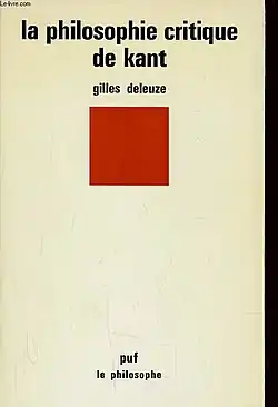 Делёз восхищался Кантом, хотя в поздний период признавал, что всегда считал его своим «врагом», отвергая кантовский суд Разума над самим собой[67][68]. Кант, с его критической ориентацией и открытием трансцендентального — строгих критериев для имманентных опыту синтезов, присутствовал уже в ранних работах Делёза[4]. В «Критической философии Канта» Делёз пишет, что кантовский гений осуществил тотальную и позитивную, чисто имманентную (противоположную трансцендентной) критику разума[4][69]. Критика Канта искала не ошибки разума, вызванные внешними причинами, а внутренние иллюзии и незаконное трансцендентное применение синтезов сознания[4]. «Коперниканская революция» Канта привела к подчинению объекта субъектом, сменив идею предустановленной гармонии между ними[70][71][72]. Субъект-объектные отношения превращаются в вопрос о соотношении или соответствии различных способностей, между которыми уже предполагается внутреннее согласие на основе априорного здравого смысла[73][74][70]. Субъект становится законодателем; Делёз рассматривает эволюцию идеи способности в трёх кантовских Критиках и заключает, что трансцендентальные способности у Канта (познавательная способность, где законодатель — рассудок; способность желания, законодатель — разум; и чувственность, законодатель — суждение) действуют только имманентно[75]. Разум как законодатель находится, под воздействием «желающей способности» (воображения), свободы воли (свободной причинности), что возвращает к эмпиризму[76][77]. В центре трансцендентального подхода Кант оставляет имманентность: третья Критика даёт имманентное решение для противоречий первых двух, фундируемое трансцендентальной способностью[76].