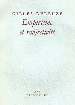 В первой книге «Эмпиризм и субъективность» Делёз предложил нестандартную трактовку философии британского эмпириста, выдвинув на первый план генезис субъективности[56][57]. Философа интересовал уровень реальности, предшествующий любой форме сознания, изучаемой тремя традициями — гегелевской диалектикой, феноменологией и фундаментальной онтологией [58]. Делёз трактует рассудок Юма как движение аффектов, их становление в качестве социальных[59], конструирование этического субъекта гарантируется искусственными культурными правилами[60]. Делёз переводит mind как esprit (дух или душа): душа у Юма не активное начало, а находится в становлении[61]. Природа человека не является моральной; напротив, это мораль вписана в нашу природу. Человеческая самость формируется через привычки и обычаи, которые упорядочивают изначально вымышленную человеческую идентичность[62][63]. Субъект есть сочетание идей; Юм первым поставил эпистемологический вопрос об эмпиризме, о данном в опыте потоке чувственного[64][57]. Делёз обнаруживает у Юма метод трансцендентальной критики и принцип различия, которые использовал в собственной философии[65]. Уже в этой книге Делёз склонялся к эмпирической инверсии Канта. Вопрос Канта — «Как данное может быть дано субъекту?»; вопрос Юма — «Как конституируется субъект внутри данного?»[56][4][66].
