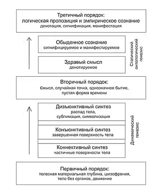 Значительные идеи трансцендентальный эмпиризм, различие и повторение, виртуальное и актуальное, сингулярности, событие, выражение, тело без органов, дизъюнктивный синтез, желающие машины, аффект, детерриторизация, сборка, ризома, номадизм, линии ускользания, складка, жизнь