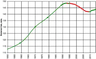 В целом за 2011 год население страны впервые возросло — на 191 тыс. (или на 0,13 %)[46]. Положительные тенденции продолжились и в 2012 году[47]. Численность постоянного населения России на 1 июля 2012 года составила 143,1 млн и с начала года увеличилась на 85,6 тыс. Всего за 2012 год родилось 1 896 263 человек, умерло 1 898 836 человек. По сравнению с аналогичным периодом 2011 года количество умерших в РФ сократилось на 26 200 человек, а количество родившихся увеличилось на 102 435 человек (прирост 5,7 %). Естественная убыль населения составила 4251 человек[48].