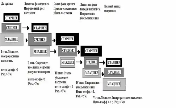 И только на пятом этапе структура населения снова приобретает прогрессивный характер и начинается рост населения страны.