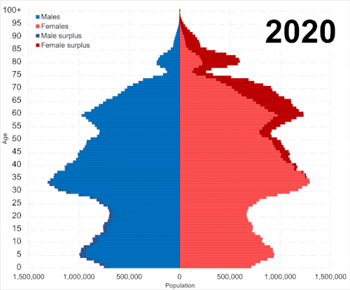 Японская нация является самой престарелой и одной из самых быстро стареющих в мире. По состоянию на 1 февраля 2025 года 29,3 % населения Японии было старше 65 лет.[7] Причиной может быть относительно непродолжительный по времени послевоенный беби-бум в Японии и строгая иммиграционная политика.