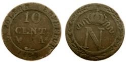 Чеканка биллонных монет в 10 сантимов начата в период Первой империи, в 1807 году. Рисунок монеты выполнил Пьер-Жозеф Тиолье. Монеты оказались непопулярны, и в 1810 году их чеканка была прекращена[1].